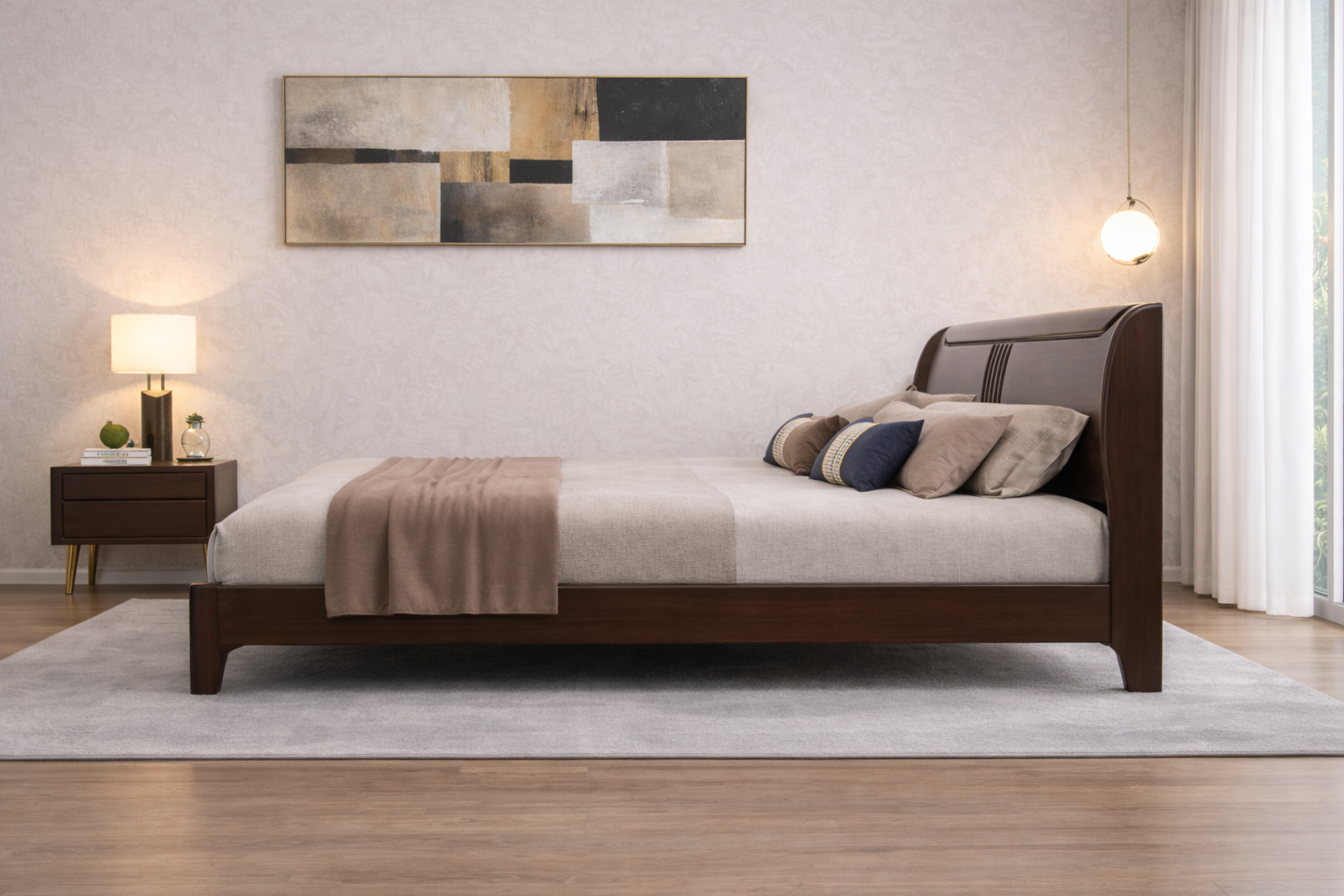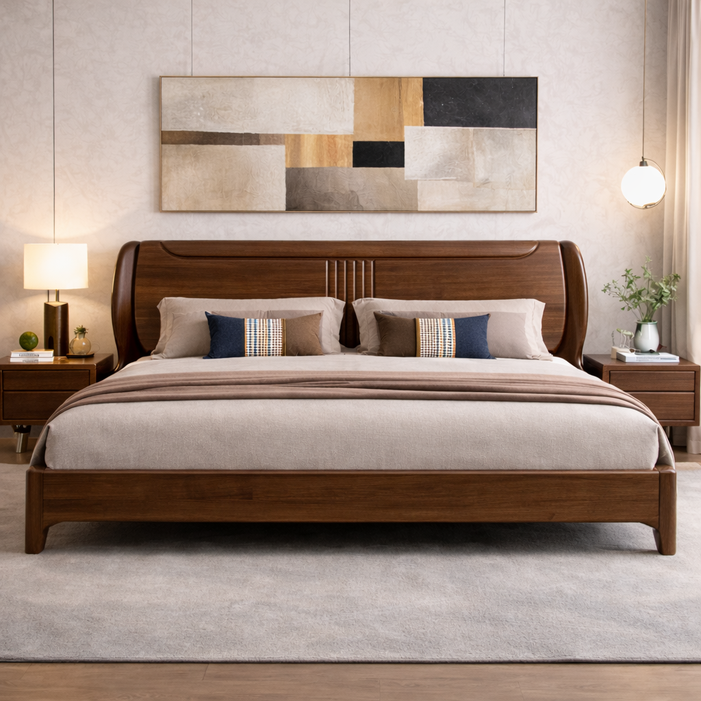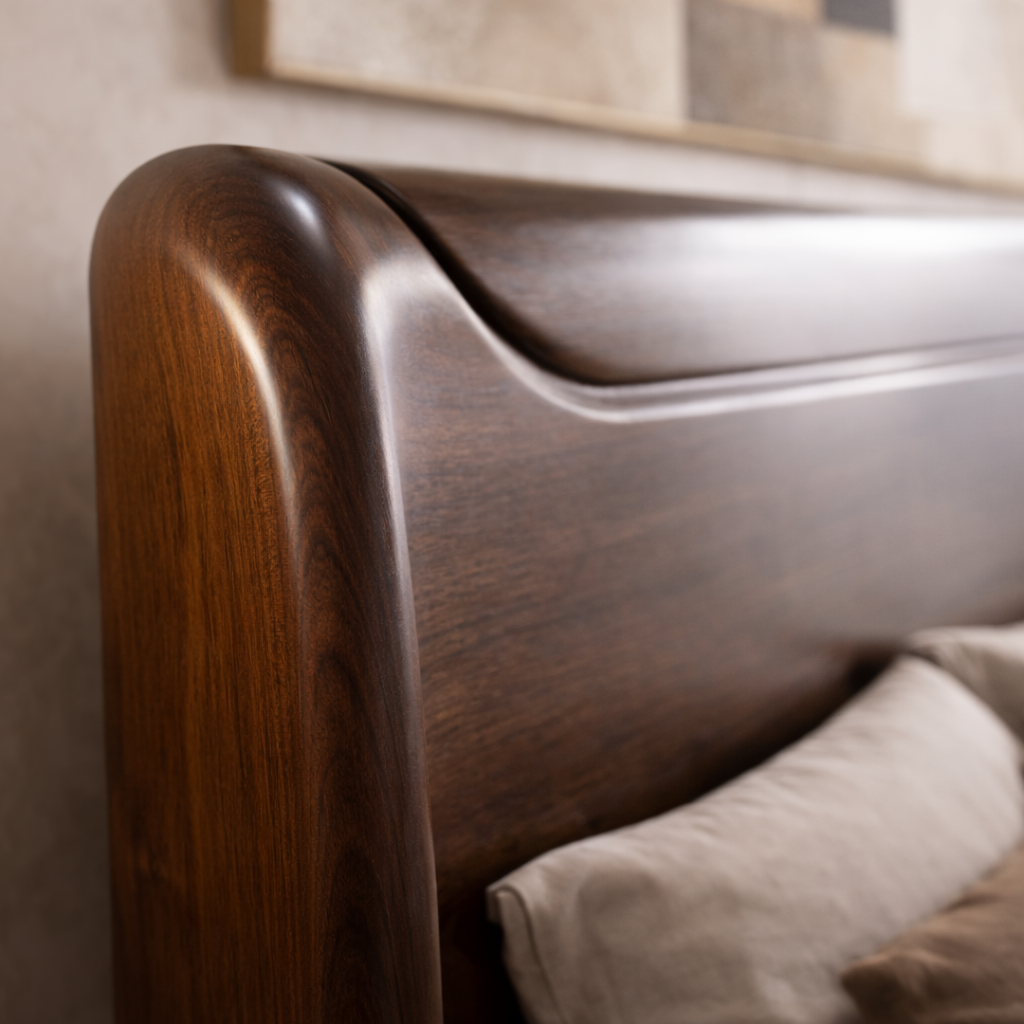 Graceful curves and refined craftsmanship define the Sculpted Walnut Sleigh Bed, a statement piece designed to bring warmth and quiet luxury to the modern bedroom. Crafted from premium solid wood in a rich walnut finish, the bed features a gently curved sleigh-style headboard that flows seamlessly into the frame, creating a silhouette that feels both timeless and contemporary.