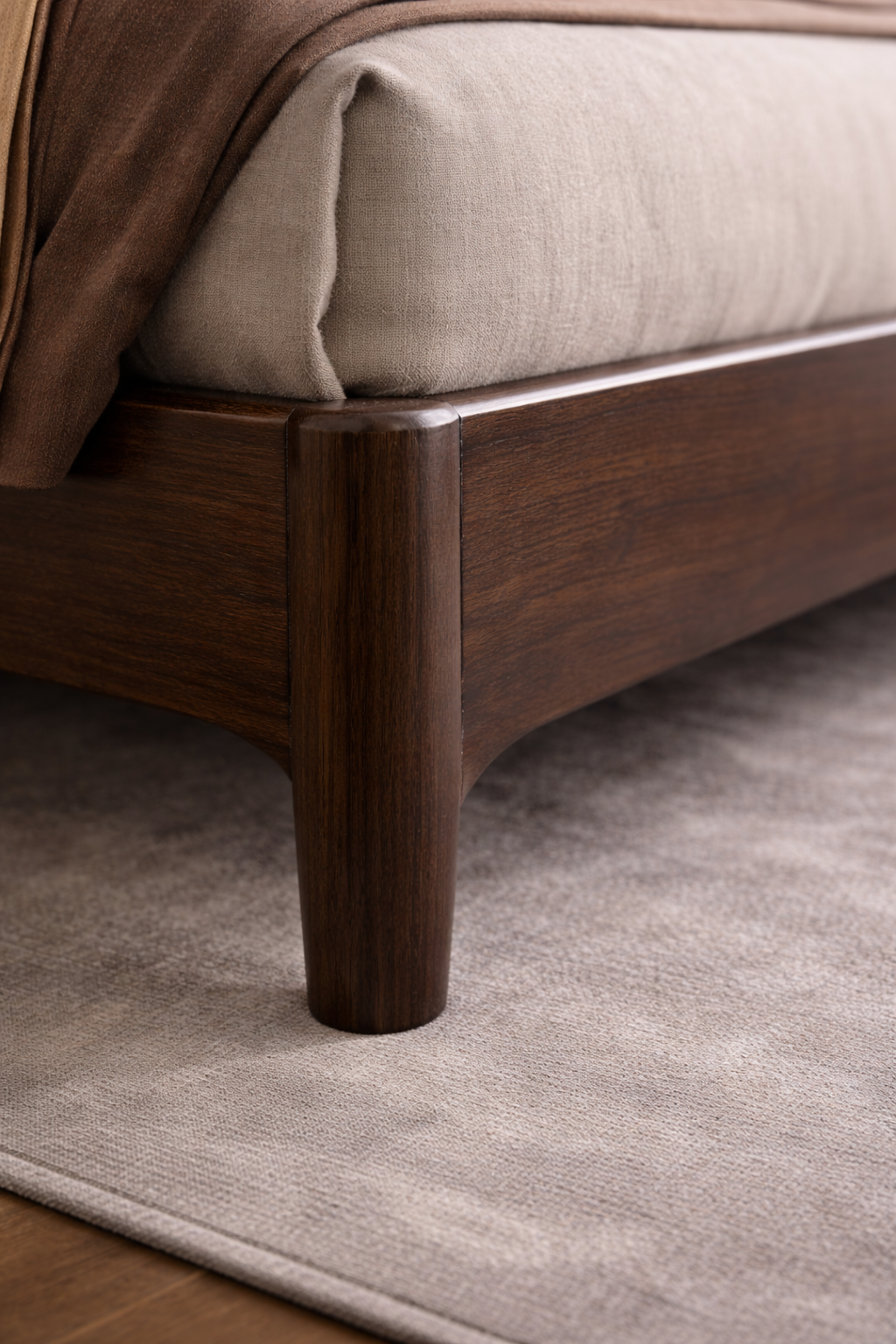 Finished in a deep walnut tone that highlights the natural grain of the wood, the bed introduces a sense of richness and calm sophistication to the space. Its understated design allows it to pair effortlessly with modern, contemporary, and mid-century inspired interiors.