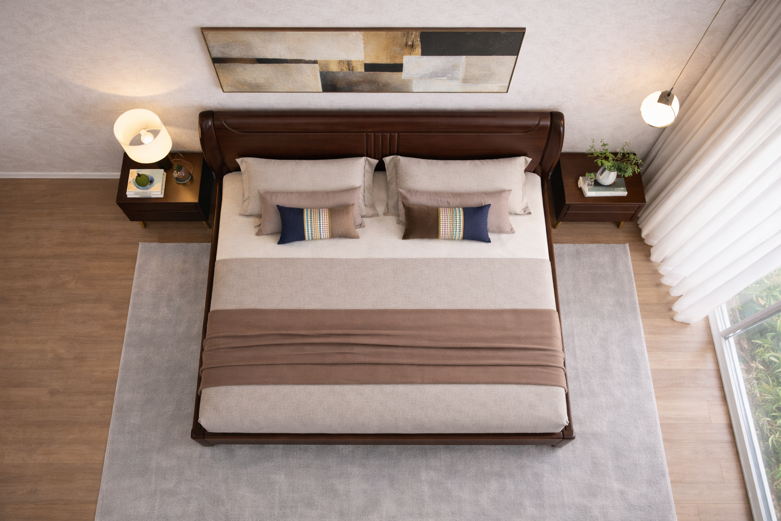 The Sculpted Walnut Sleigh Bed blends classic inspiration with modern restraint, creating a bedroom centerpiece that feels effortlessly sophisticated and enduring.
